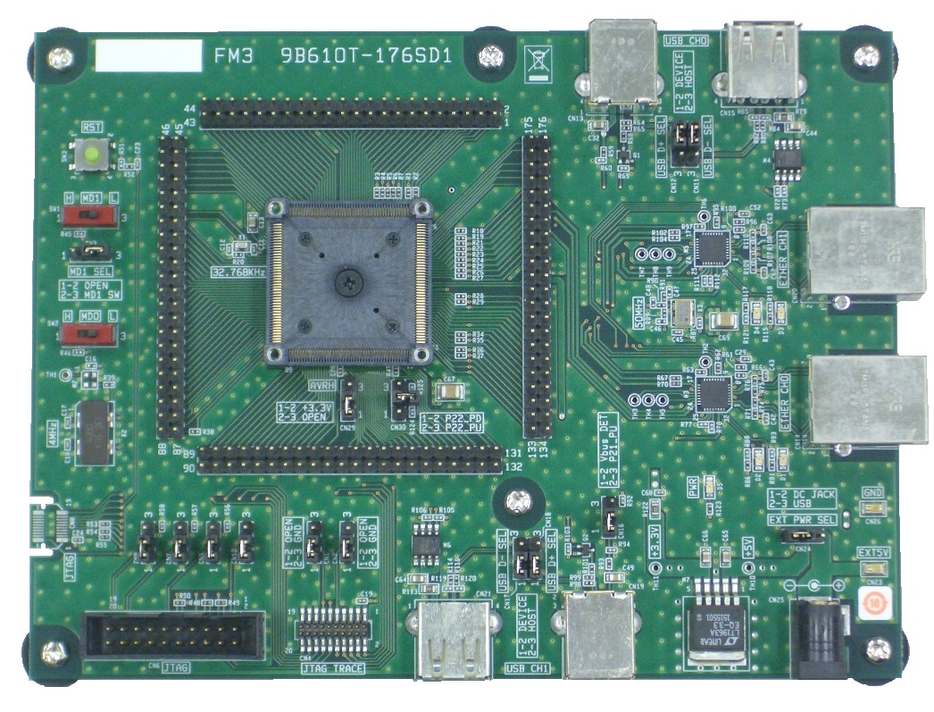 「FM3ファミリ」,「FM4ファミリ」及び「FM0+ファミリ」をソケットに搭載できる評価ボードです。 マイコン端子の全ピンがテストピンとして用意されているので,回路などを目的のI/Oポートに簡単に接続して動作確認が出来ます。